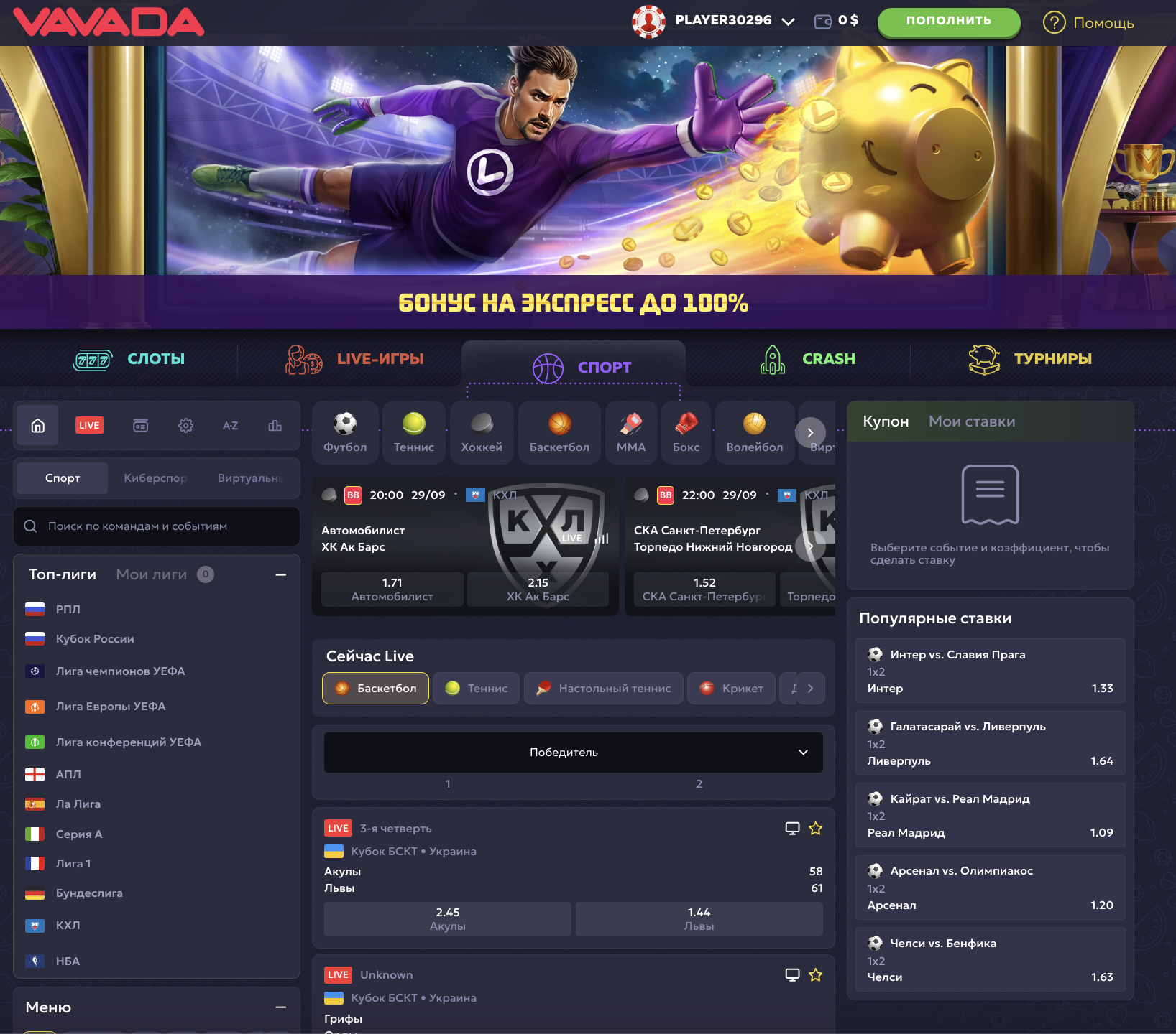 В линии собраны десятки дисциплин: футбол, хоккей, теннис, баскетбол, UFC, настольный теннис и другие популярные виды спорта. Доступны не только международные турниры топ-уровня, но и локальные чемпионаты.